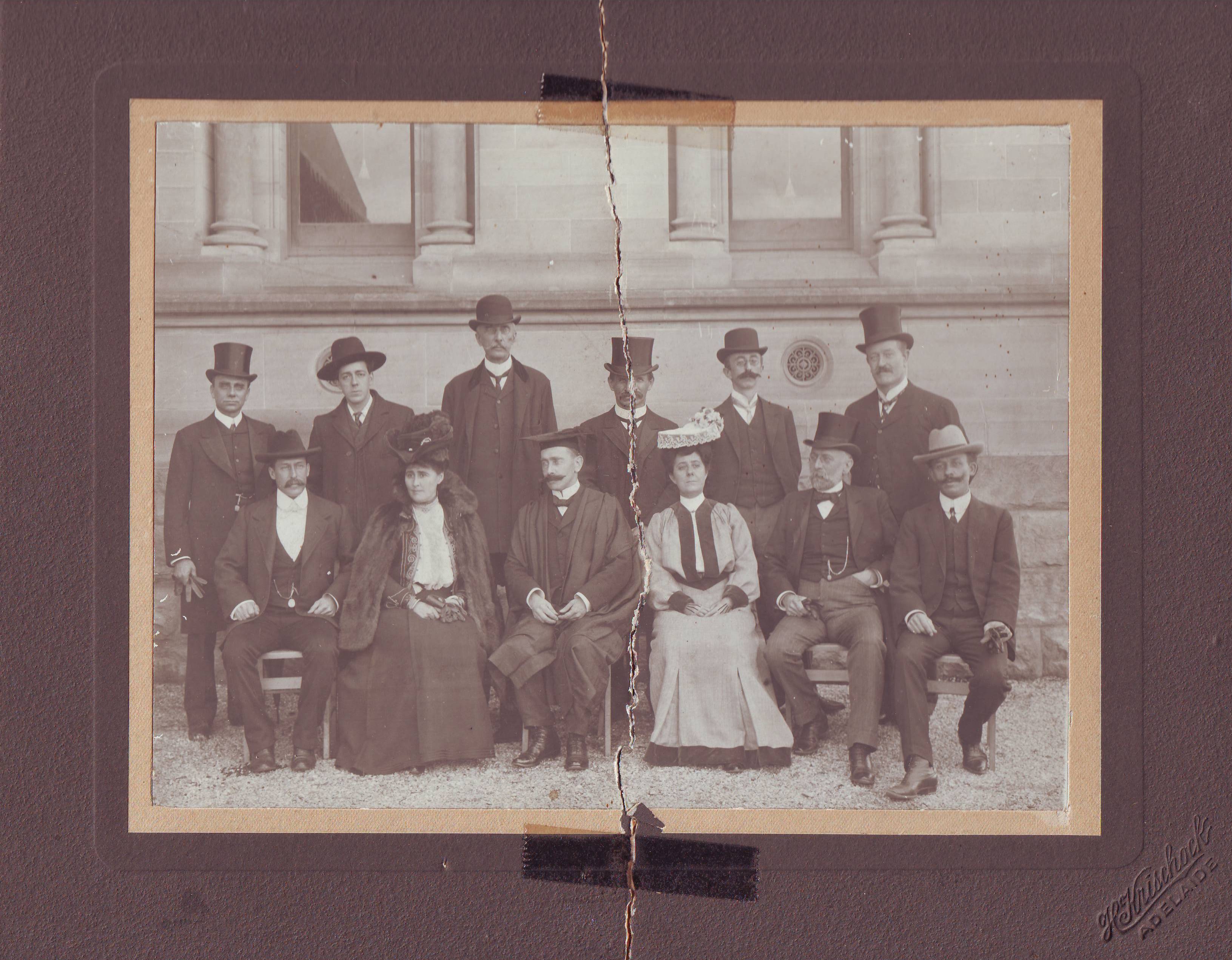 Mounted black & white photograph (tear down centre). Photographer: H. Krischock, Adelaide. Top row: Edward Reeves, Bryceson Treharne, ? , Immanuel Reimann, ? , Frederick Bevan. Bottom row: ?, ?, Professor Ennis, Miss Guli Hack, ?, Hermann Heinicke.