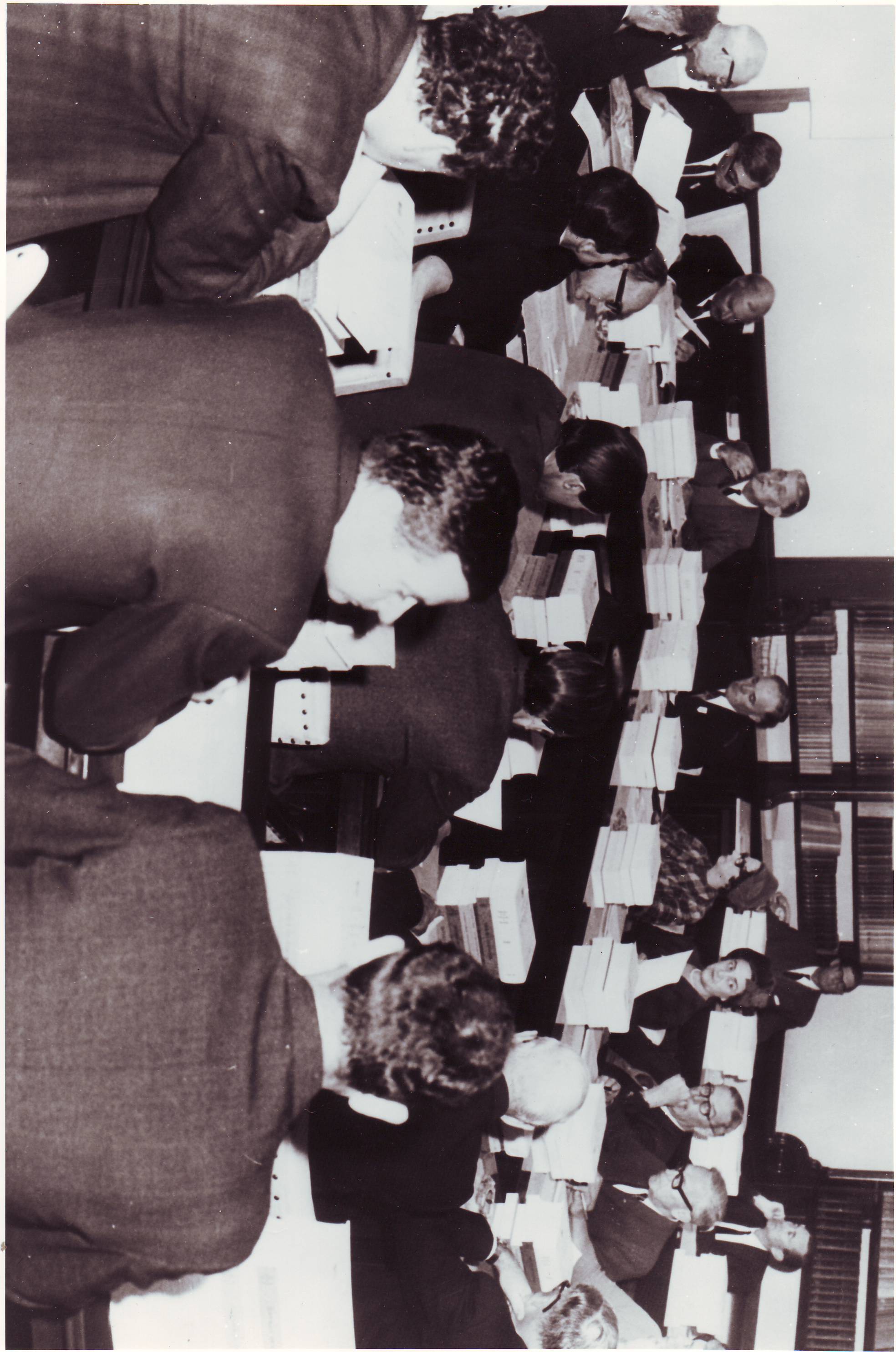 Black & white photograph. At table at back on extreme right: (From left) - Henry E. Wesley-Smith, Glen R. Broomhill, M. P. At inner table (from right): ? (in line with Glen Broomhill), Alan H. Lendon, Jean Gilmore, Roma F. Mitchell, ?, Victor A. Edgeloe (Registrar), John J. Bray (Chancellor), Samuel J. Jacobs, Rev. William F. Hambly (Dep. Chancellor), John A. Dunning, ?, Prof. Renfrey B. Potts, Edwin Harry Medlin, etc.