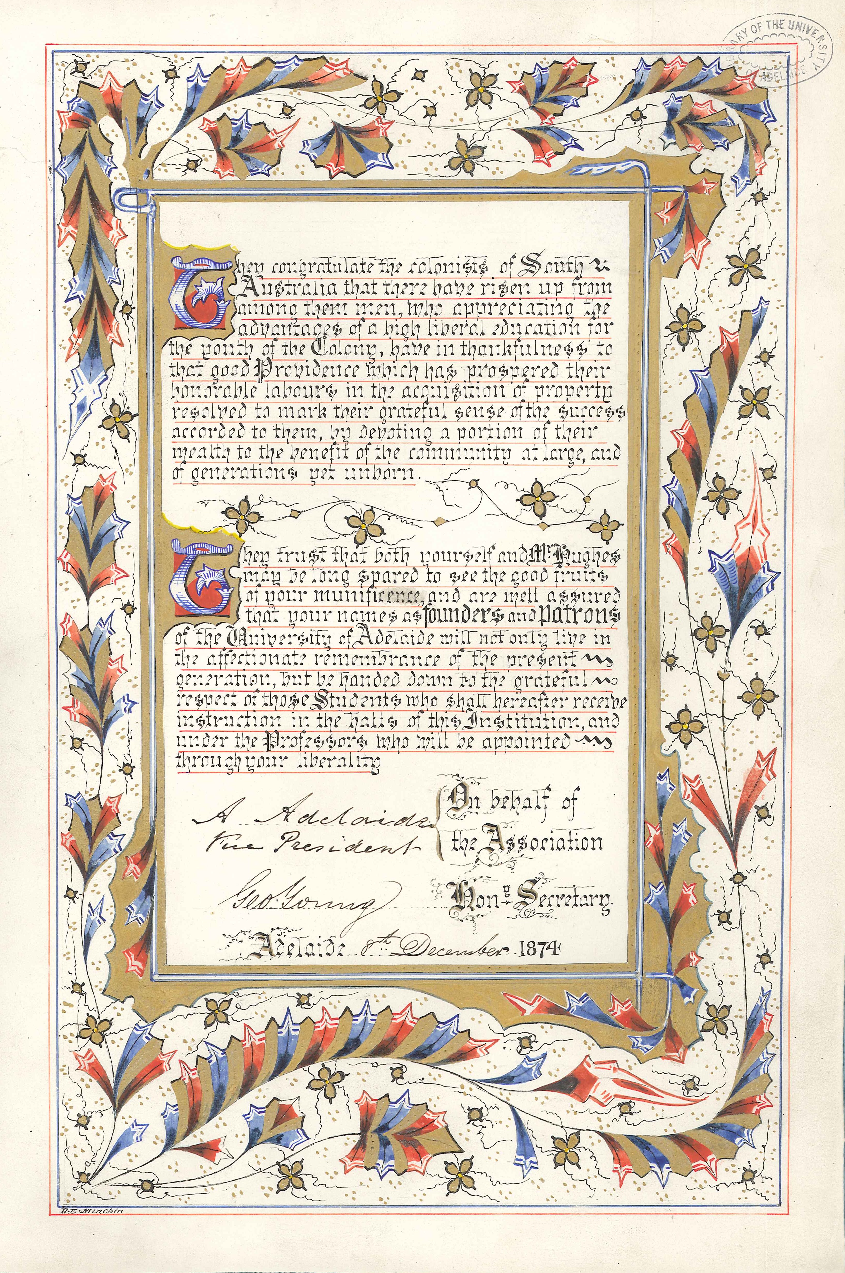 They trust that both yourself and Mr. Hughes may be long spared to see the good fruits of your munificence, and are well assured that your names as founders and patrons of the University of Adelaide will not only live in the affectionate remembrance of the present generation, but be handed down to the grateful respect of those Students who shall hereafter receive instruction in the halls of this Institution, and under the Professors who will be appointed through your liberality.