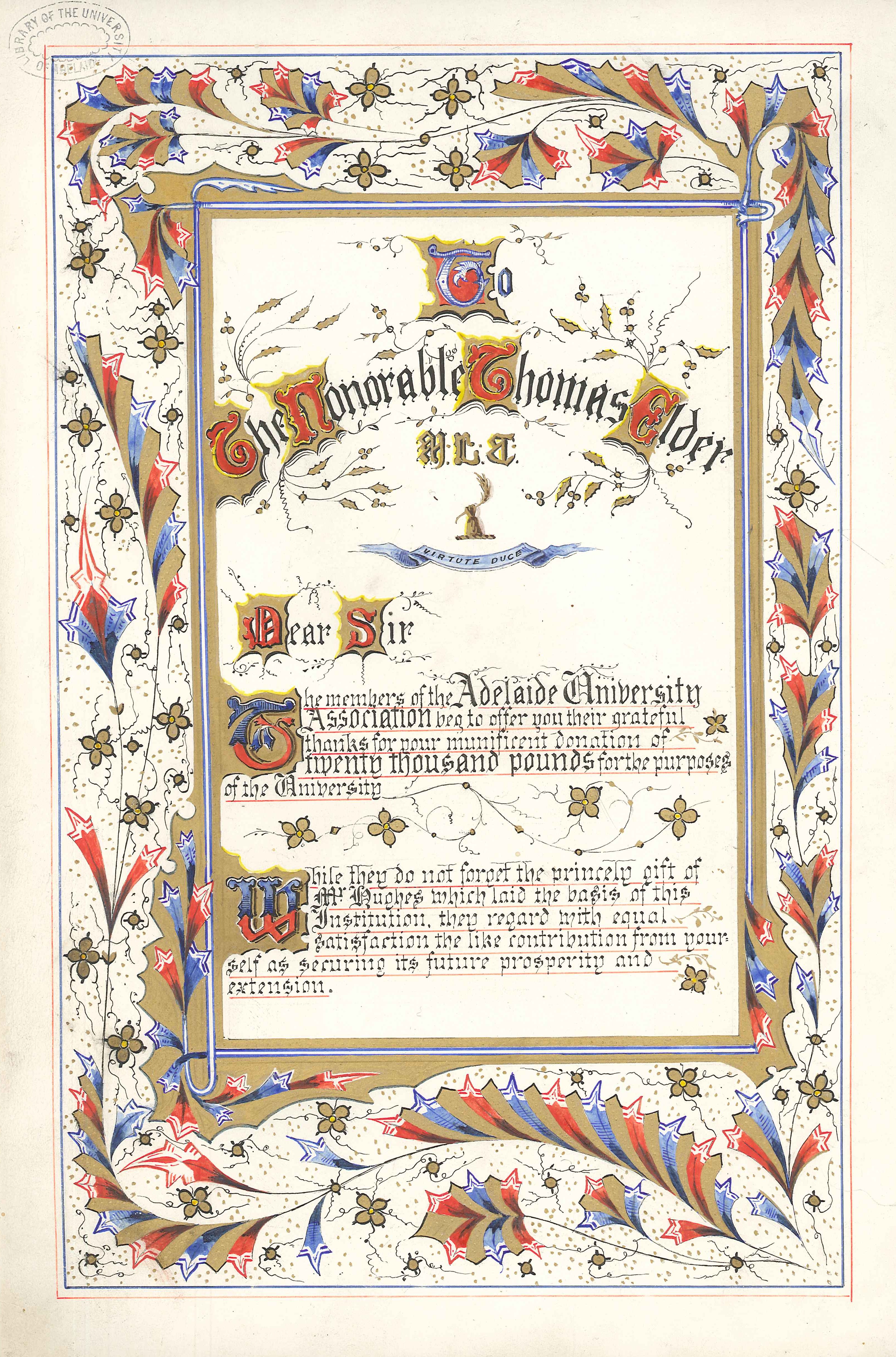 The address was presented to Sir Thomas Elder in appreciation of his gift of 20,000 pounds to the University on the passage of the Act of Incorporation in November 1874. The donation was "to be applied by the governing body in the manner best calculated to promote the interests of the Institution, without limitations or conditions on his part" and at the decision of Council in January 1875 was used to establish two chairs, one in Mathematics and the other in Natural Science. The first two Elder professors were Horace Lamb and Ralph Tate.
