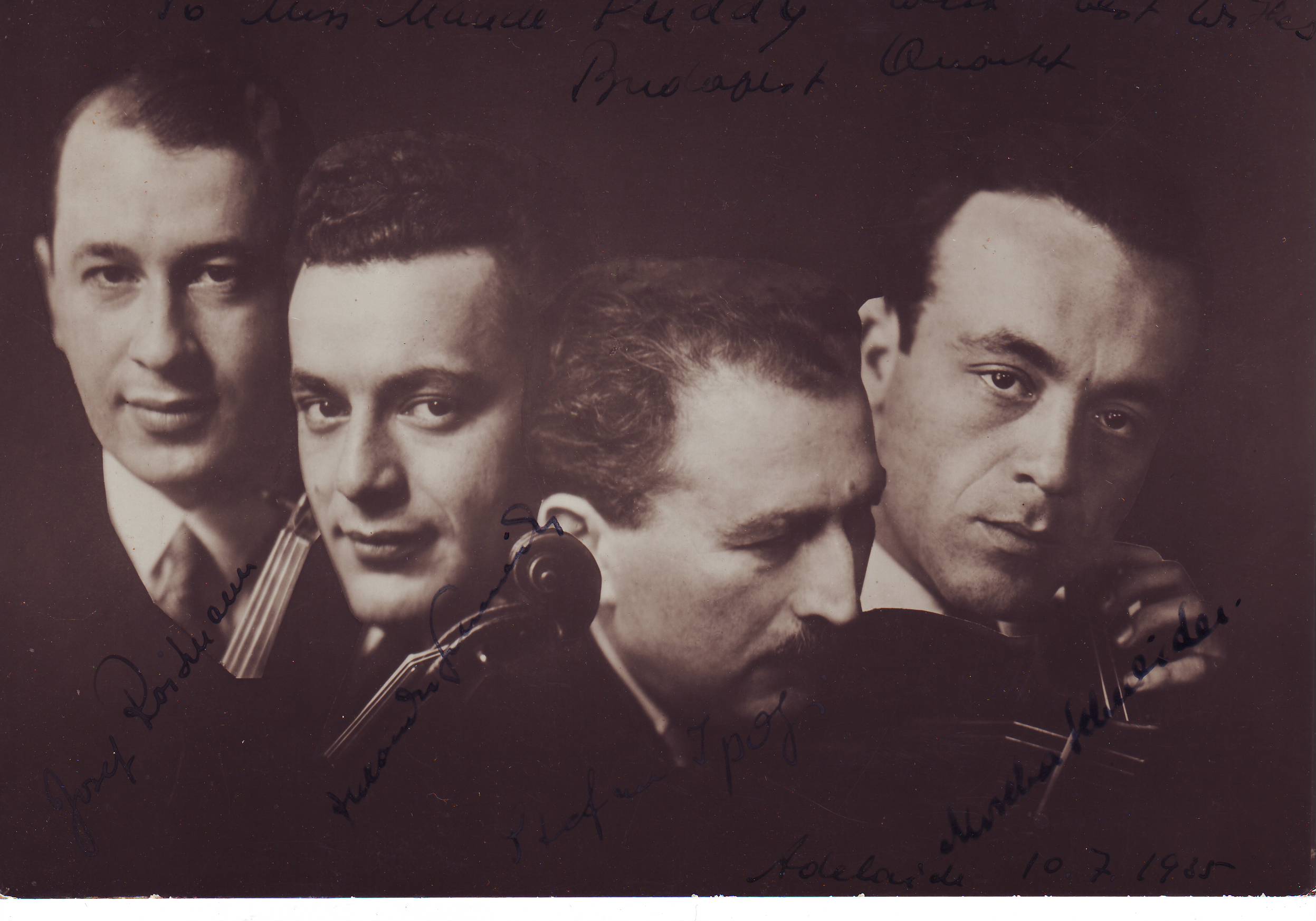 Black & white photograph. Caption: "To Miss Maude Puddy with best wishes Budapest Quartet - Josef Roisman, Alexander Schneider, Istvan Ipolyi, Mischa Schneider. Adelaide. 10. 7. 1935."