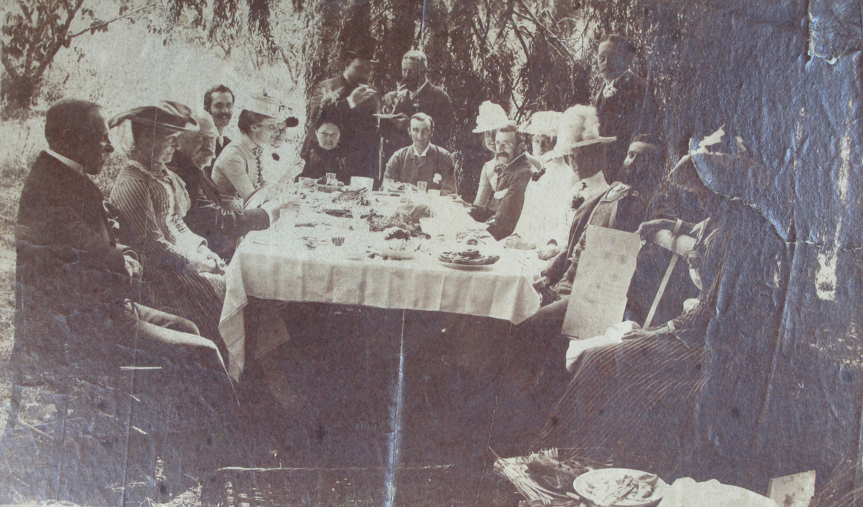 Montacue picnic 1887, from left, Professor Edward Stirling, Archibald Watson, W.H. Bragg