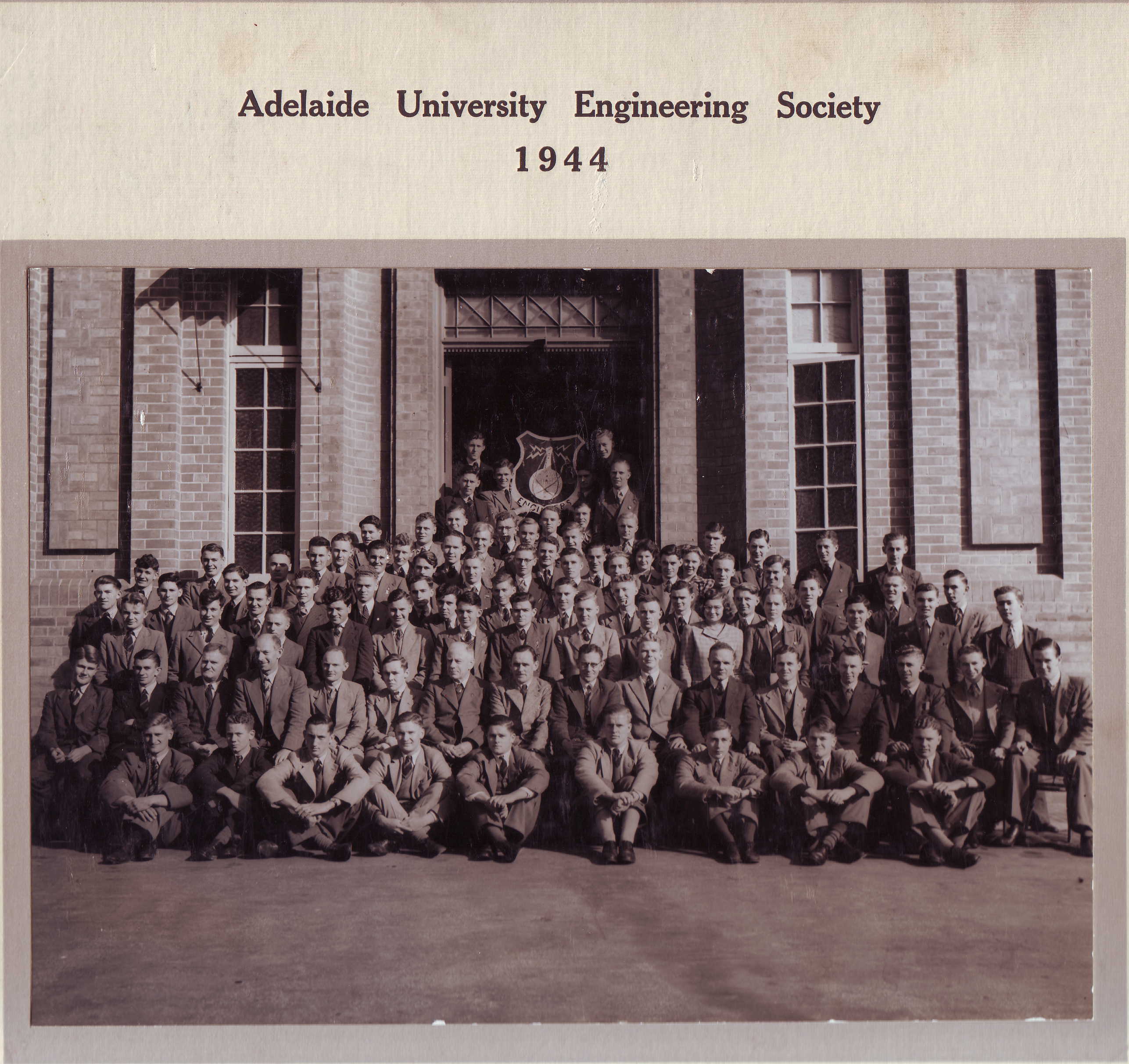 B & w mounted photograph. Donated by Mr. A. J. Robinson. In doorway: J. W. Crompton, D. E. Martin, D. P. Roberts, R. J. Stapledon, A. M. Noble, G. V. Harry, T. W. Hardy, B. Carthew, D. P. Michelmore, R. D. Koch, D. C. R. Drew. 6th row: D. J. Hendry, T. H. Waterhouse, J. C. Rounsevell, L. T. Sykes, O. R. Evans, A. J. Wilkins. 5th row: D. C. Arnold, B. L. Jones, L. R. Brown, R. D. White, K. A. McKechnie, Miss B. L. Bolin, Miss R. Finlayson, P. G. B. Claridge, L. T. Nicholls (Committee), W. R. Arnold. 4th row: C. M. Johnson, B. C. Bills, A. N. Jensen, H. K. Wellington, G. S. Wilson, D. M. Martin, B. D. Williams, D. H. Brown, G. K. Chesterman, G. J. Burdon, G. E. Stolz, C. G. Jose, L. J. O'Daniel. 3rd row: D. G. Brooks, W. D. Freestun, W. O. Alm, E. D. Knott, A. G. Cooke, R. G. Stillwell, P. D. Barlow, G. H. Matheson, B. B. Macmahon, D. Medlow, B. A. Jennings, L. H. Mitchell, K. Dudley, P. S. Brokensha, R. F. Cox, I. Hector. 2nd row: M. A. Otto, B. R. Beresford, L. R. Henschke, R. E. LeMessurier, R. W. Holden, R. L. Forss, R. J. James, M. S. Paterson, R. Culver, Miss M. E. Angas, Miss E. M. Woods, J. H. Scarfe, T. S. Bryce, C. G. Cameron. 1st row (seated): R. W. Parsons (Committee), R. W. Vogt, Mr. R. W. Parsons, Mr. W. H. Schneider, Mr. W. G. Forte, J. R. Kleeman (Secretary), Prof. H. W. Gartrell, J. P. Morgan (President), Prof. R. C. Robin (Dean of Faculty), N. G. Hosking (Vice-President), Mr. T. A. Farrent, N. S. Vawser (Treasurer), Mr. A. J. Robinson, D. H. Tyler, J. Reynolds, R. H. Galliford. Seated on ground: A. R. Curry, D. S. Blair, L. D. Hughes, D. A. C. Reid, K. A. Ritchie, J. L. Whittle, M. C. Warden, R. O'H. Giles (Committee), J. D. Copley.