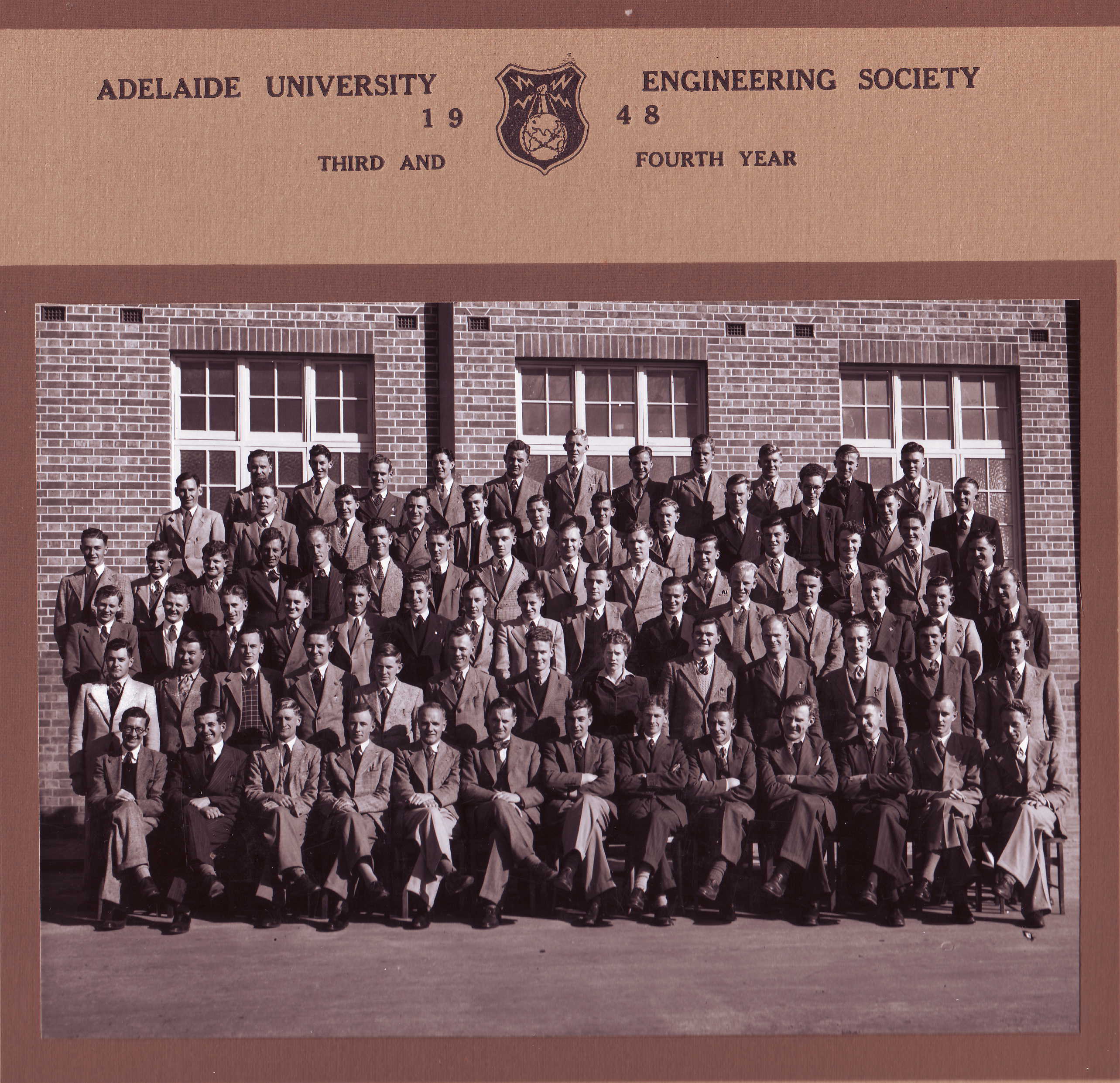 Mounted b & w photograph. Donated by A. J. Robinson. Back row (left to right): D. A. C. Reid, C. H. Dearman, R. G. Cowper, H. A. Cowper, A. G. Scott, R. W. Durdin, R. W. Holden, J. L. Whittle, P. W. Butterworth, R. H. Casling, F. Marston. Fifth row (left to right): N. C. Shierlaw, J. D. Copley, C. M. Johnson, B. L. Stanton, G. J. Lewis, D. J. Noblett, A. J. F. Brame, J. H. Bails, N. K. Tilbrook, B. J. Brooks, R. J. Poole, K. G. Thomas. Fourth row (left to right): R. B. Moffit, J. G. Allardice, H. J. White, N. L. McGowan, A. M. Kinnear, J. F. O'Grady, R. A. Schutz, A. C. Parsons, J. W. Crompton, F. H. Russell, M. W. Allen, E. A. Clothier, W. M. Rice, C. S. Taylor, S. Kaneff. Third row (left to right): A. M. Bray, F. W. Vincent, L. J. Daly, F. J. Slattery, R. B. Jennison, I. B. Ketteridge, J. W. Nairn, I. B. McBryde, G. A. Lewis, F. Bazely, D. E. Calder, L. W. Gehling, S. G. F. Ross, K. V. Winch. Second row (left to right): J. E. Harris, J. M. Griggs, E. R. Kennett, J. A. Nelson, D. J. Alexander, E. J. Koop, D. J. Omond, Miss E. M. Woods, R. B. Wake, B. D. O'Brien, G. J. Burdon, J. D. C. Crisp, A. D. Stanley. Front row (left to right): Mr. B. Downs, Mr. J. P. Duncan, A. R. Curry, Mr. R. Culver, Mr. T. A. Farrent, Professor E. C. R. Spooner, A. J. MacArthur (President), Professor H. H. Davis (Dean of Faculty), Professor R. C. Robin, Professor E. O. Willoughby, Mr. R. E. Vowels, B. P. Opie (Vice-President), D. J. Bath (Secretary).