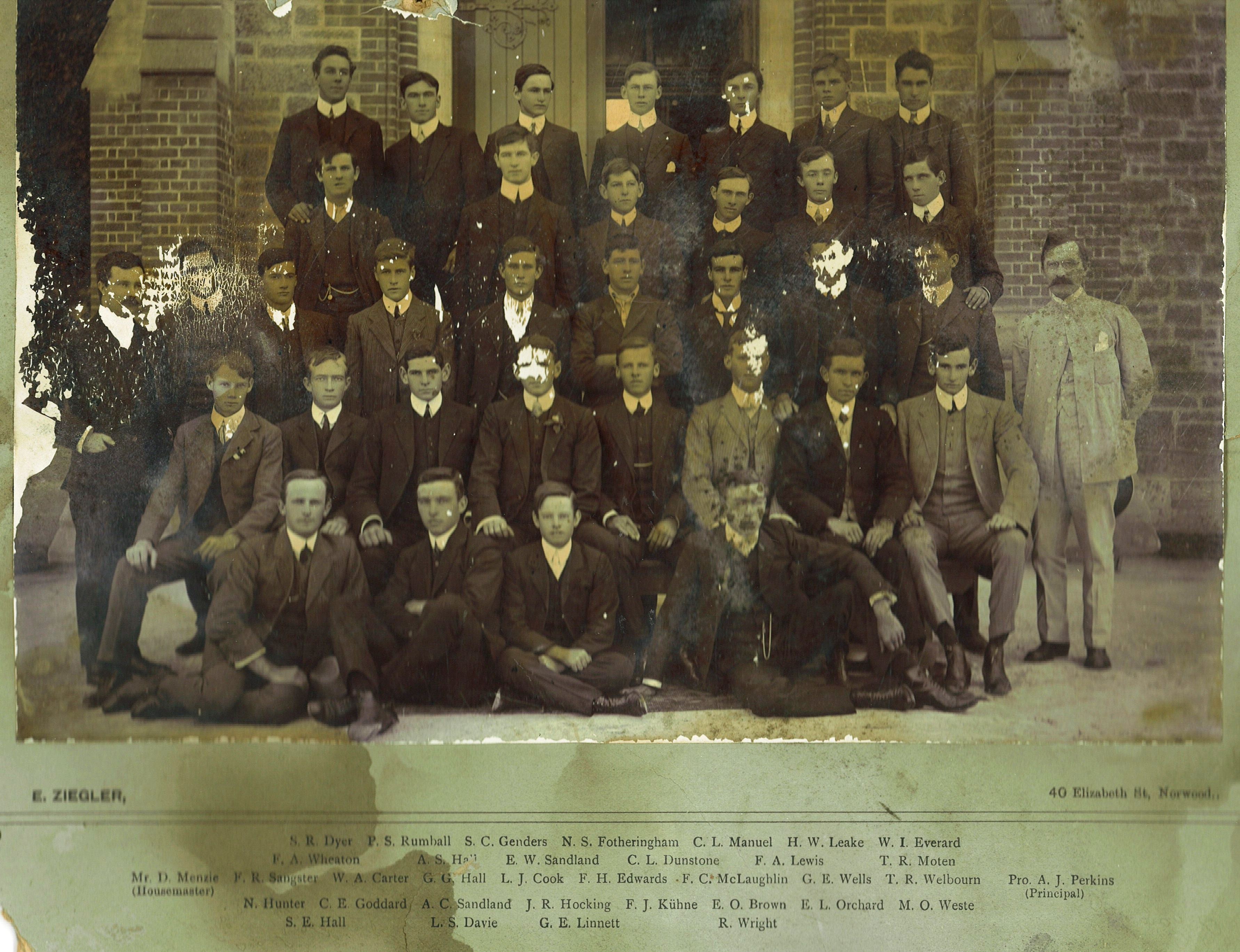 1908-09 students: back - SR Dyer, PS Rumball SC Genders, NS Fotheringham, CL Manuel, HW Leake, WI Everard; fourth row - FA Wheaton, AS Hall, EW Sandland, CL Dunstone, FA Lewis, TR Moten; third row: Mr D Menzie (Housemaster), FR Sangster, WA Carter, GG Hall, LJ Cook, FH Edwards, FC McLaughlin, GE Wells, TR Welbourn, Prof AJ Perkins (Principal); seated - N Hunter, CE Goddard, AC Sandland, JR Hocking, FJ Kuhne, EO Brown, EL Orchard, MO Weste; front - SE Hall, LS Davie, GE Linnett, R Wright.