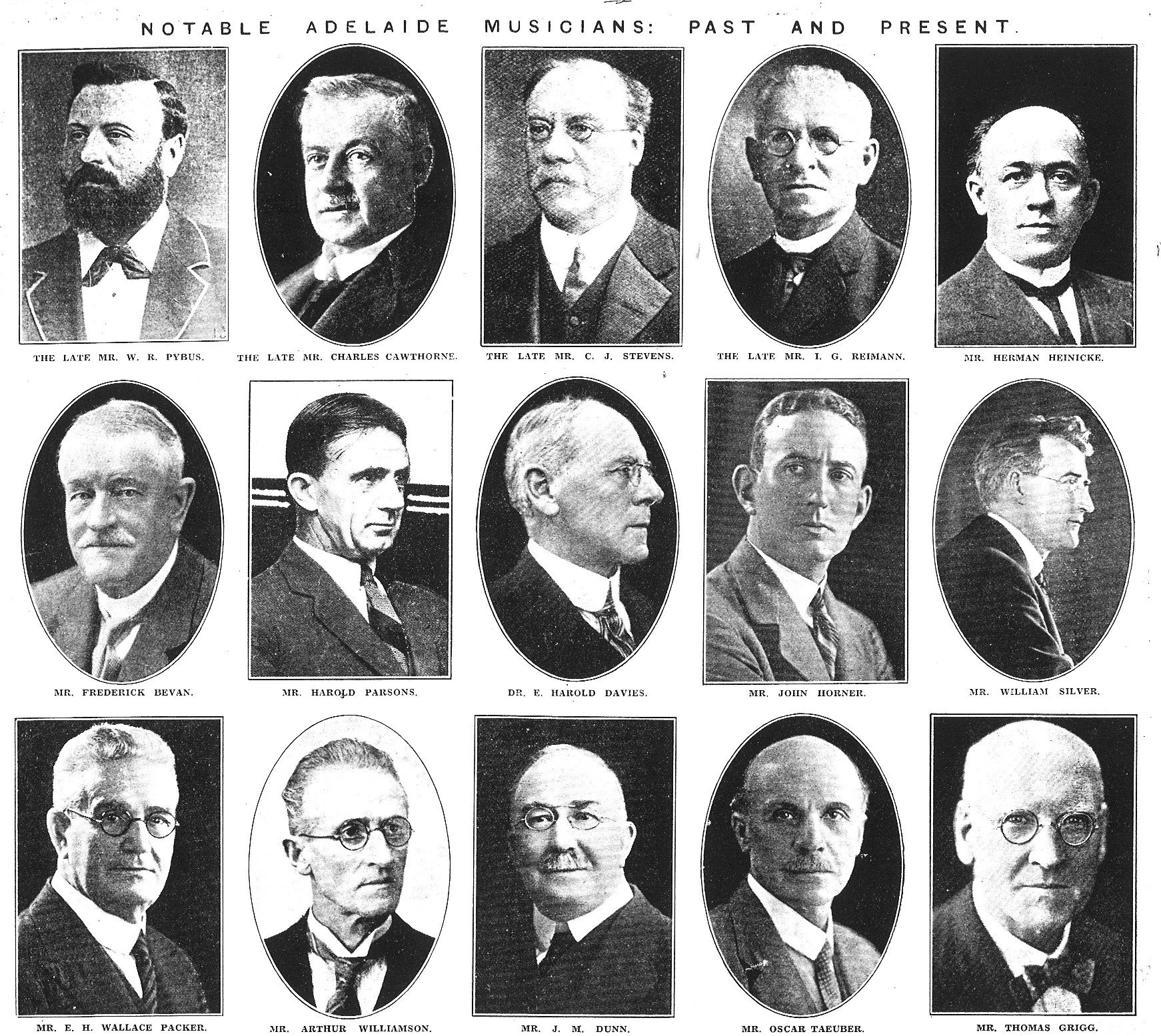 Portraits of W P Pybus, Charles Cawthorne, C J Stevens, I G Reimann, Hermann Heinicke, Frederick Bevan, Harold Parsons, E Harold Davies, John Horner, William Silver, E H Wallace Packer, Arthur Williamson, J M Dunn, Oscar Taeuber and Thomas Grigg.