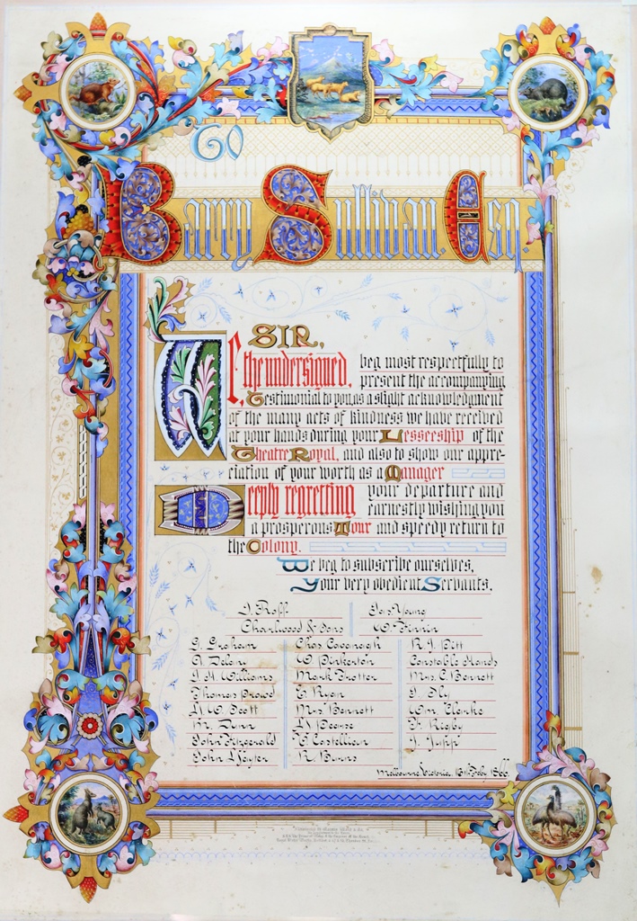 Illuminated by Marcus Ward & Co. Decorations include vignettes of Australian Animals. Presented the night of his final performance at the Theatre Royal before he left for London.