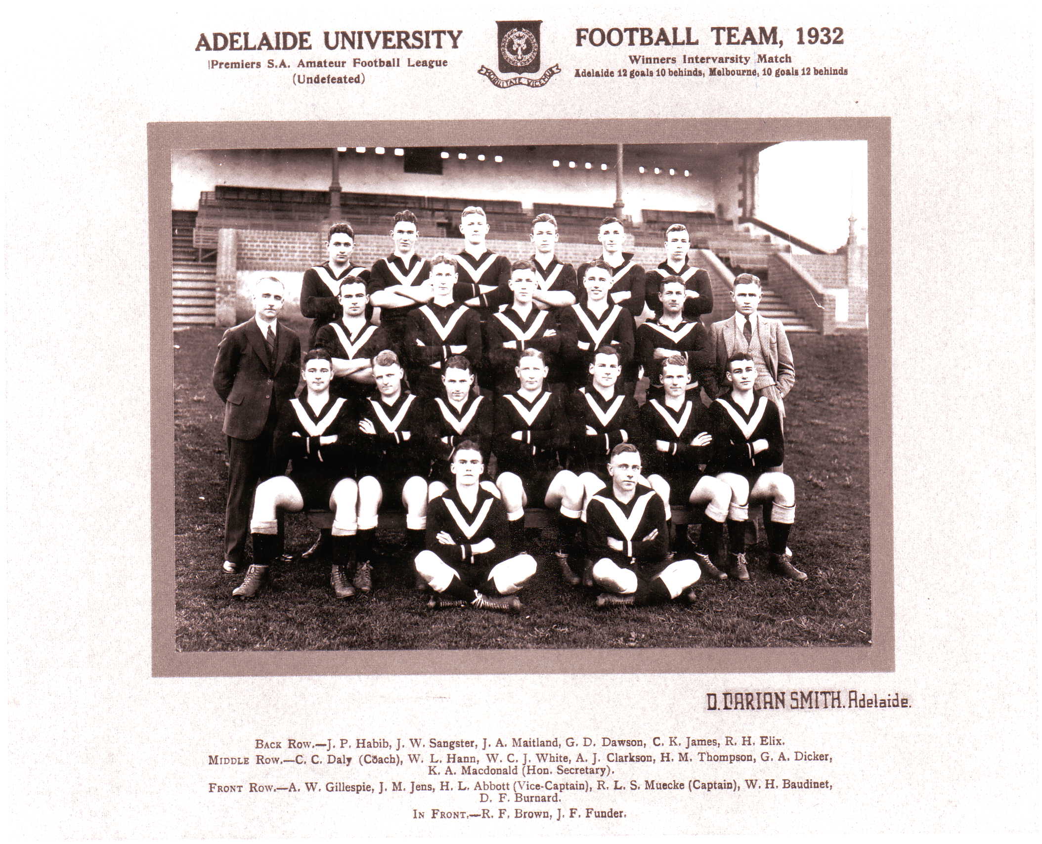 Copied in 1988 from originals in possession of D. F. Burnard. Photographer: D. Darian Smith, Adelaide. Premiers, S.A. Amateur Football League (Undefeated). Winners Intervarsity Match, Adelaide 12 goals 10 behinds, Melbourne 10 goals 12 behinds. Back row: J. P. Habib, J. W. Sangster, J. A. Maitland, G. D. Dawson, C. K. James, R. H. Elix. Middle row: C. C. Daly (Coach), W. L. Hann, W. C. J. White, A. J. Clarkson, H. M. Thompson, G. A. Dicker, K. A. Macdonald (Hon. Secretary). Front row: A. W. Gillespie, J. M. Jens, H. L. Abbott (Vice-Captain), R. L. S. Muecke (Captain), W. H. Baudinet, D. F. Burnard. In Front: R. F. Brown, J. F. Funder.