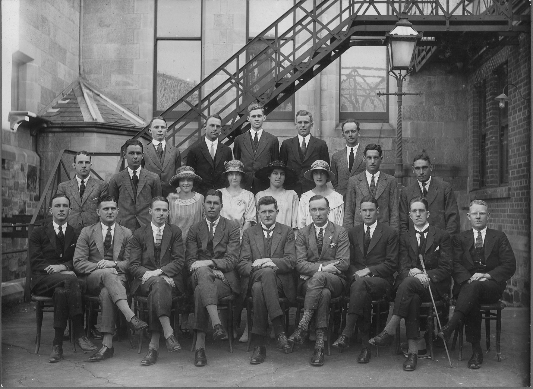 Mounted black and white photograph. BACK: I A Hamilton, R D Hornabrook, N A Brooke, A E Leidig, P A Ohlstrom. MIDDLE: H M Lees, A H Lendon, Miss E Wigan, Miss G Ure, Miss L Morris, Miss M Hardy, T D Finey, C T Piper. FRONT: M T Cockburn, L C Maiden, A S Cocks, G M Hone, R H Wallmann, D A Dowling, M V Samuel, H Mc Birch, H G Prest.