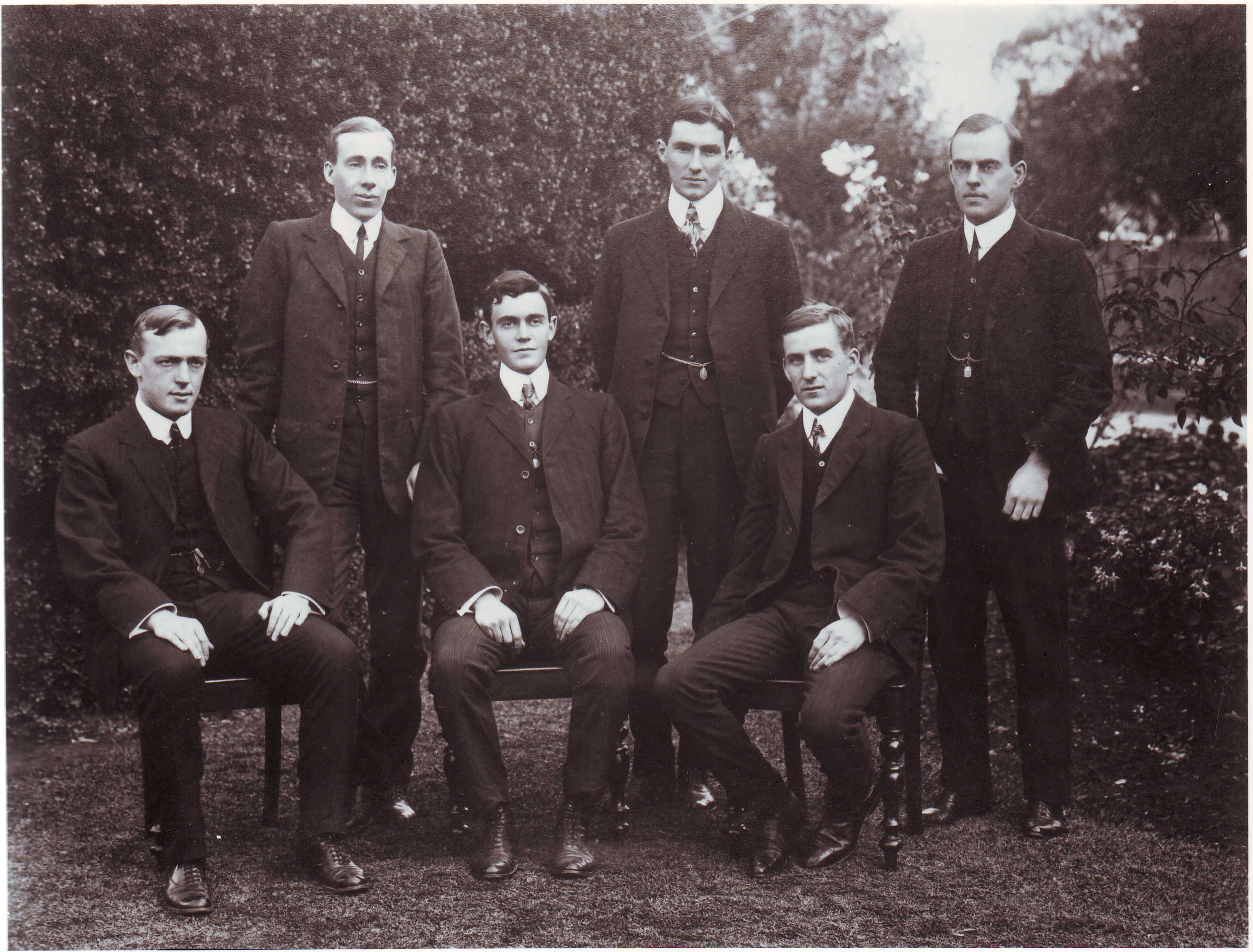 Black & white photograph. Standing: Gordon Roy West, Percival Thomas Spower Cherry, Darcy Rivers Warren Cowan. Sitting: Matthias Erichsen, Henry Kenneth Fry, Ernest John Frayne.