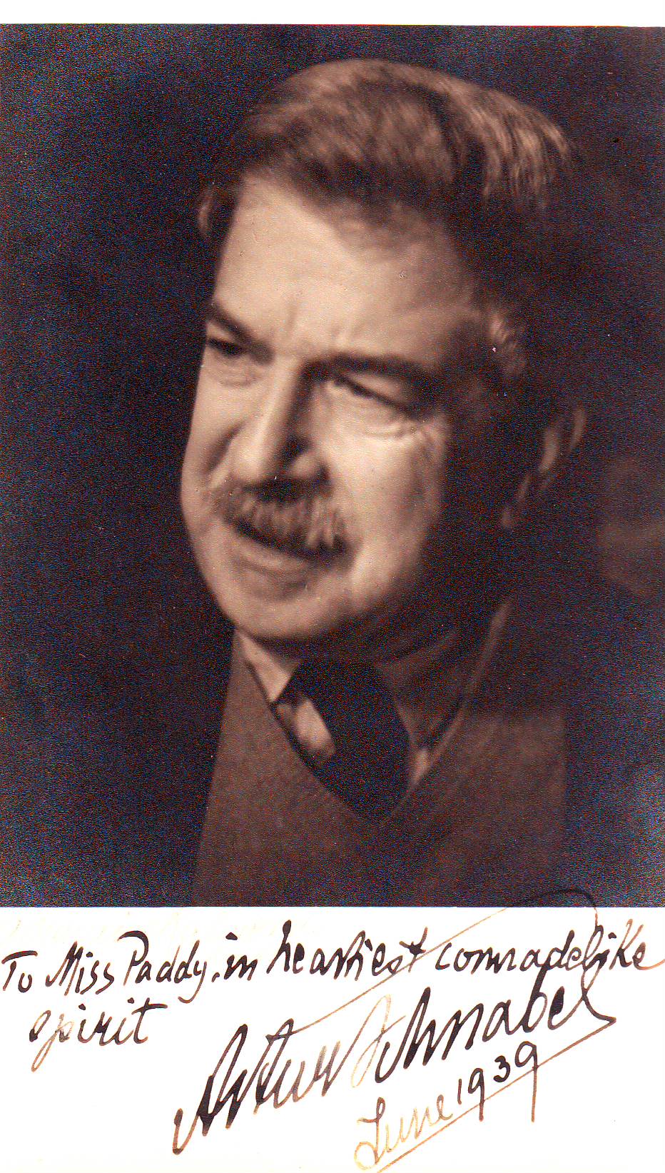 From the Maude Puddy Collection. Sepia photograph. Caption: "To Miss Puddy, in heartiest comradelike spirit. Arthur Schnabel June 1939."
