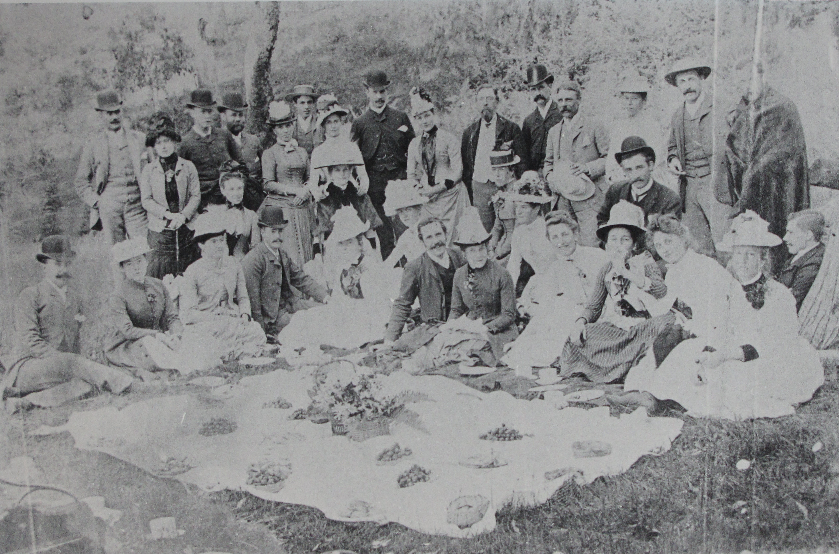 Possibly picnic for Post Office staff in the Adelaide Hills c.1886-8. Charles Todd standing in centre, his son-in-law W.H. Bragg and daughter Gwendoline seated in centre of the picnic spread.