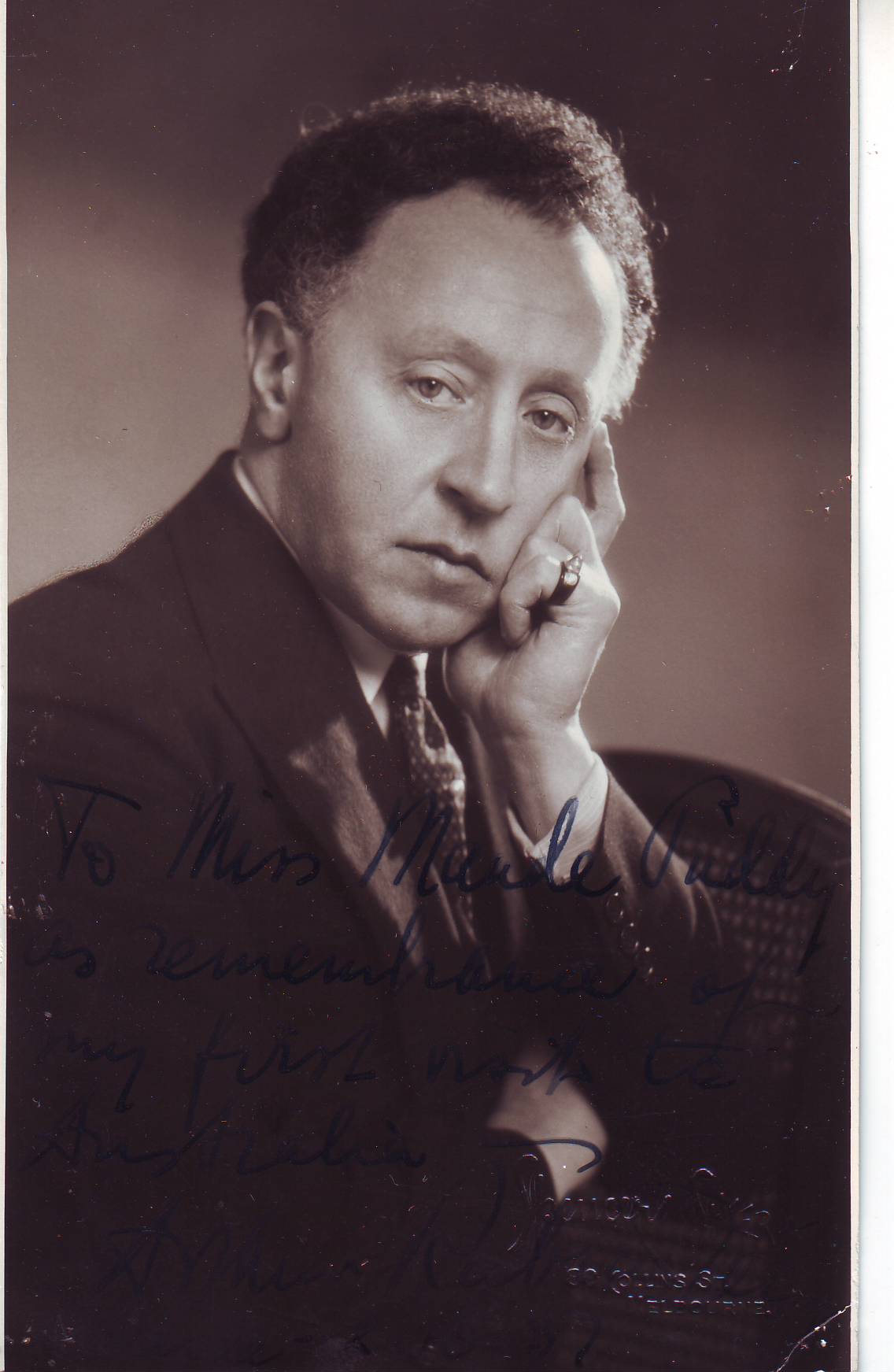 From the Maude Puddy Collection. Sepia photograph. Photographer: Spencer Shier, 80 Collins Street, Melbourne. Caption: "To Miss Maude Puddy as remembrance of my first visit to Australia, Arhur Rubinstein, Adelaide 2.10.37."