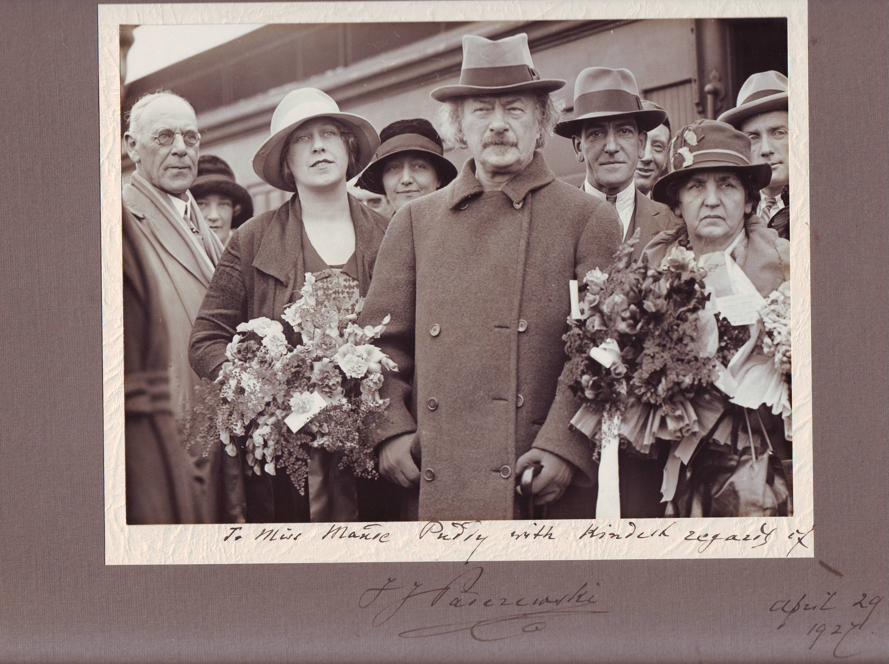 Black & white photograph. From left: Professor Harold Davies, ?, Stella Wilson, Maude Puddy, I. Paderewski, Manager, ?, Mrs. Paderewski, ?. Caption: "To Miss Maude Puddy with kindest regards of I. J. Paderewski April 29th 1927.