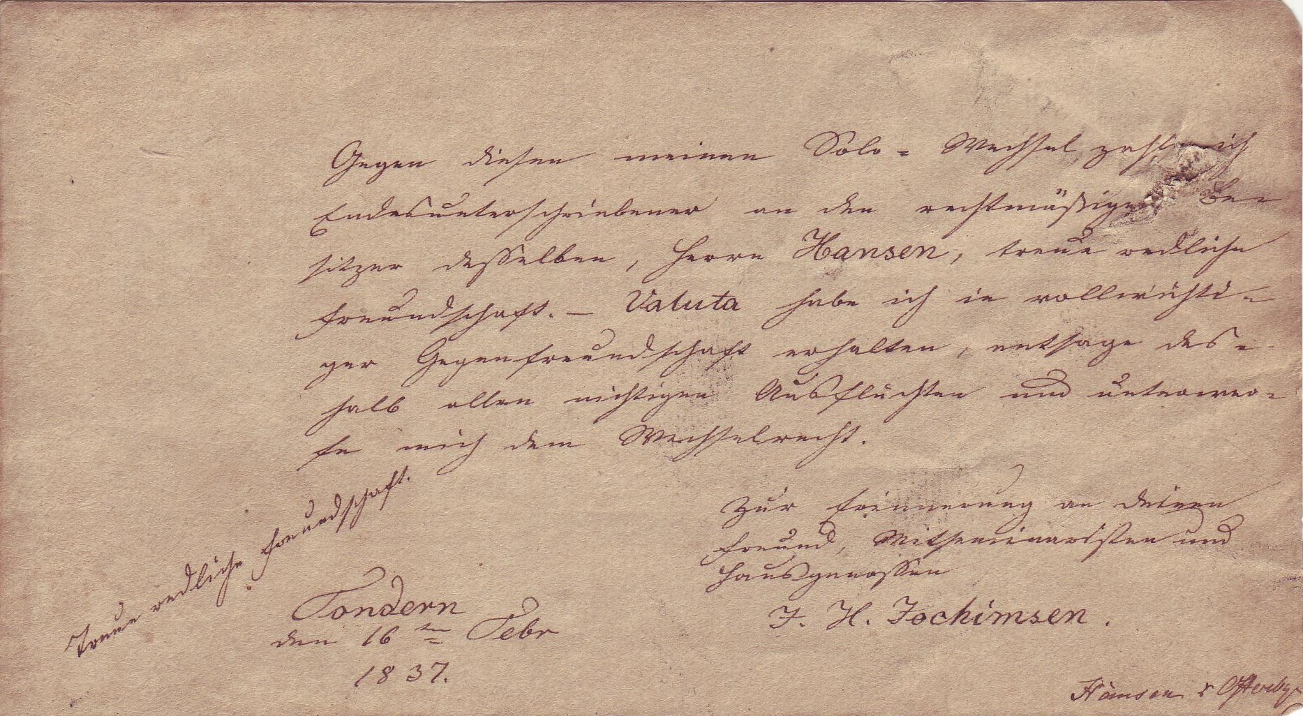- Verse on small piece of paper dated 16 Febr. 1837, by F.H. Jochimsen